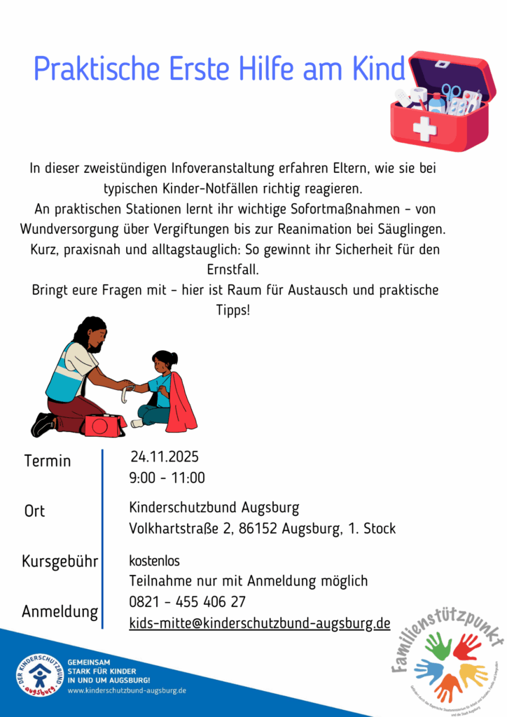 Der Familienstützpunkt K.I.D.S. Mitte bietet Eltern und Interessierten einen kostenfreien Erste Hilfe Kurs an. Wir bitten um Anmeldung!