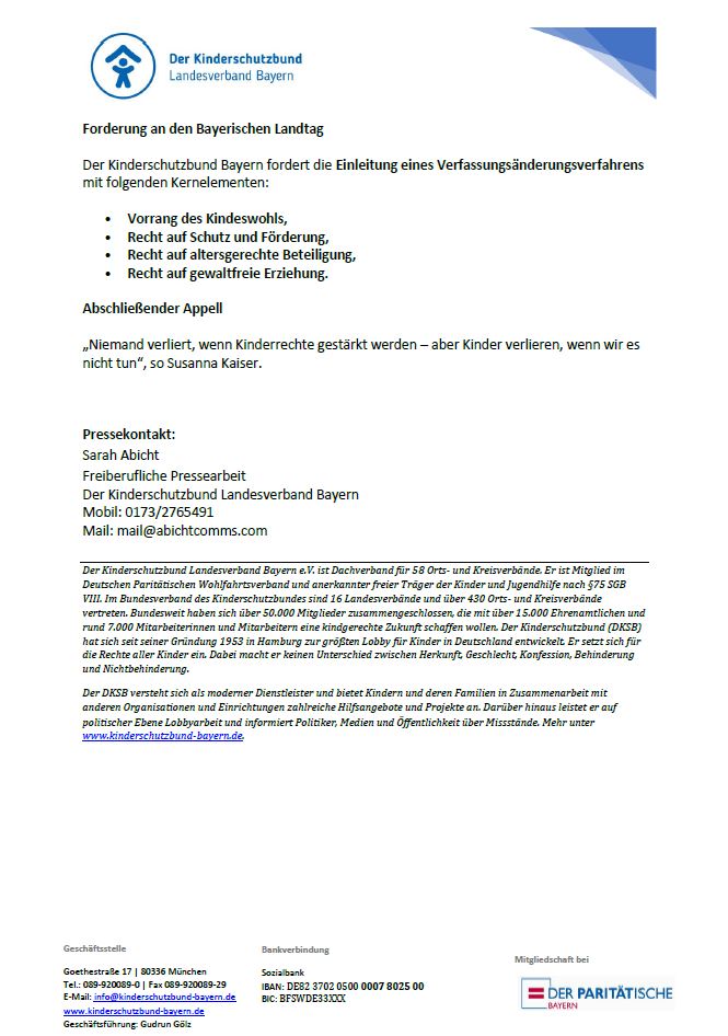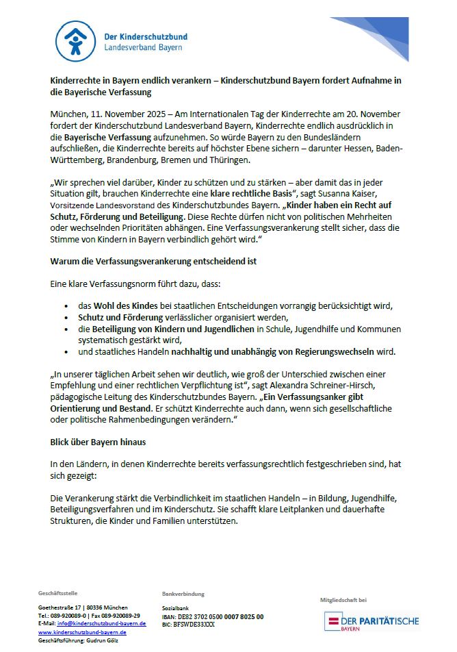 Der Landesverband Kinderschutzbund Bayern fordert anlässlich des Tages der Kinderrechte die Verankerung in die Bayerische Verfassung. Wir schließen uns gerne an .